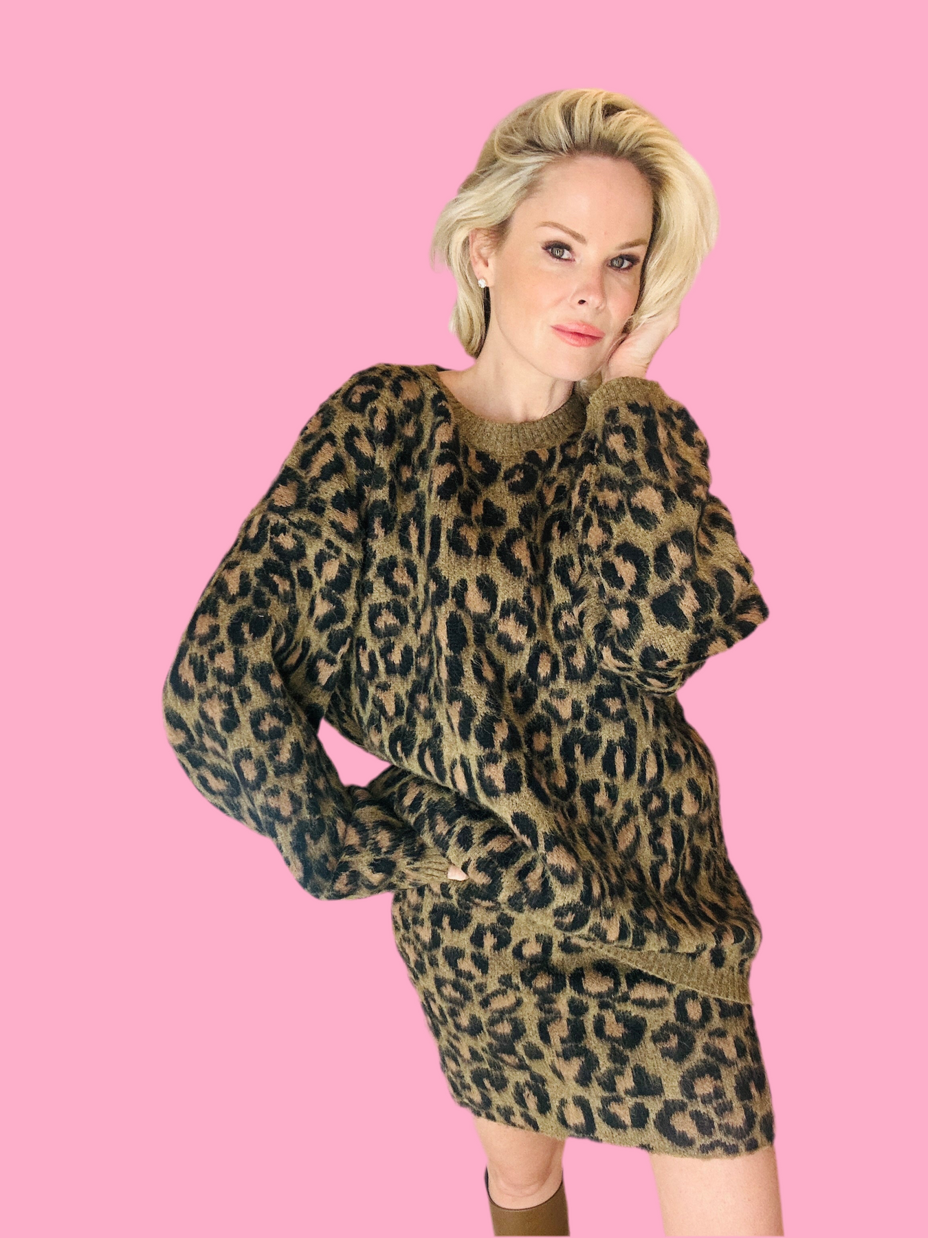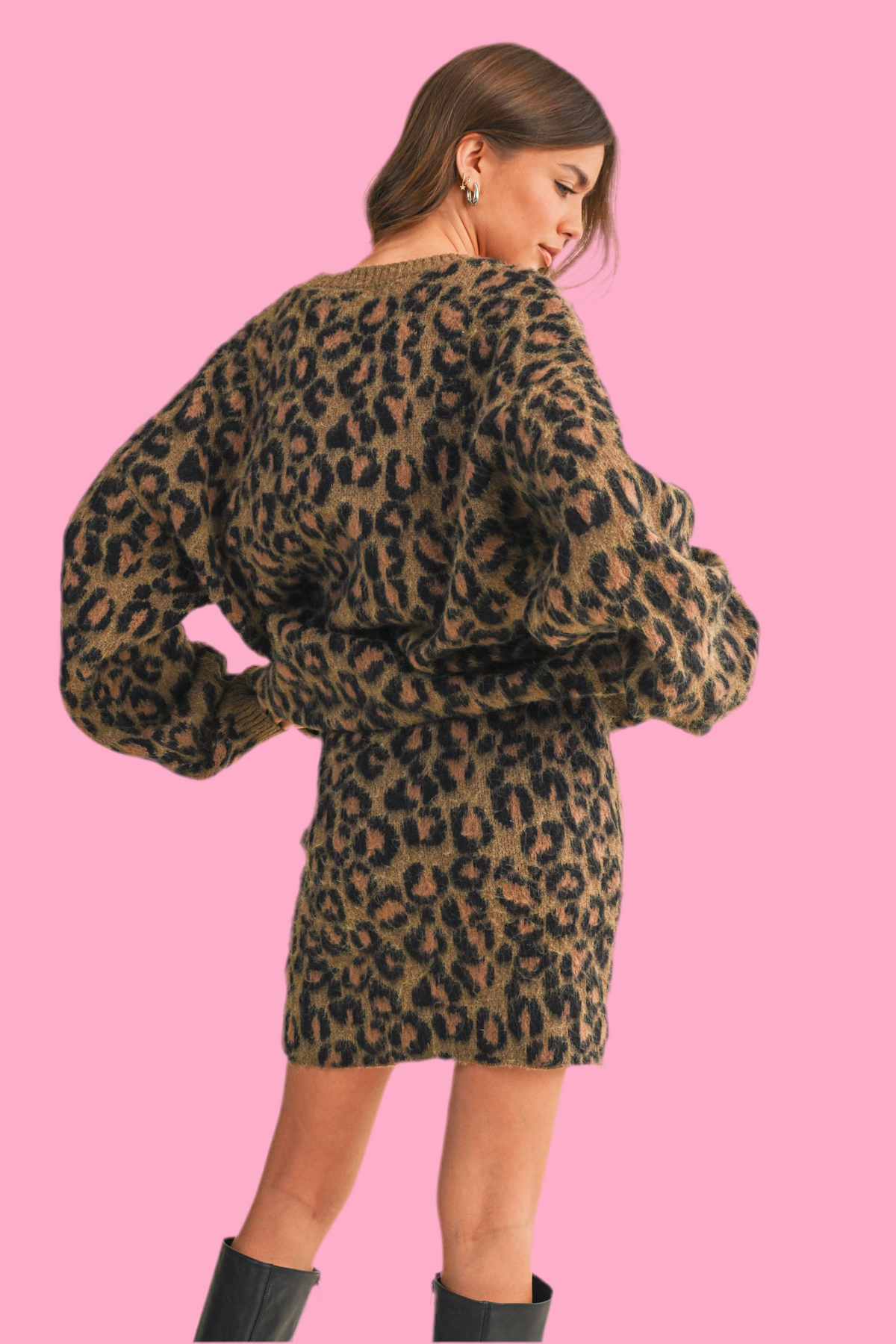 Get ready to unleash your wild side with The Agnes Set! Featuring an animal printed oversized sweater top and skirt, this set will make you stand out in any crowd. Stay cozy and stylish with this playful and unique ensemble.