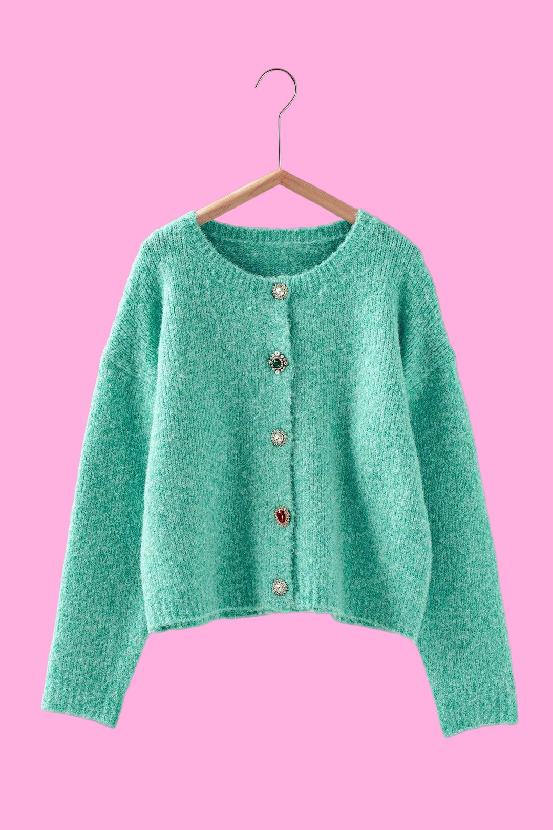 Jeweled Button Fuzzy Knit Crew Cardigan