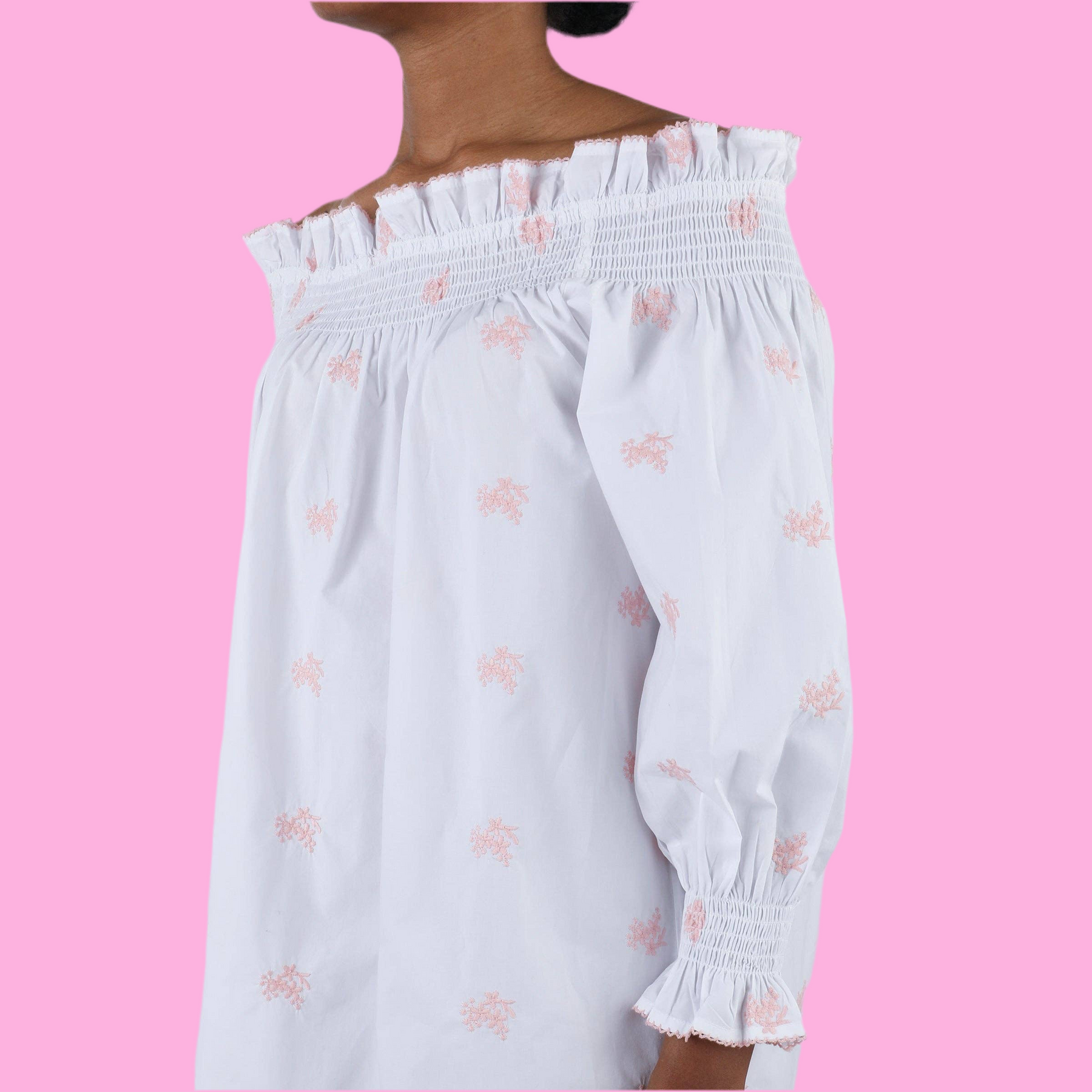 The Nancy Embroidered Long Sleeve Nightgown is designed for cozy nights and leisurely mornings. Made from 100% cotton, this midi-length nightgown is lightweight and breathable..The ¾-length sleeves, ruched neckline, and cuffs provide a relaxed yet graceful fit, while delicate floral embroidery adds a timeless, feminine touch. Finished with scalloped embroidered trim, this nightgown is perfect for those who love classic style with a touch of romance.