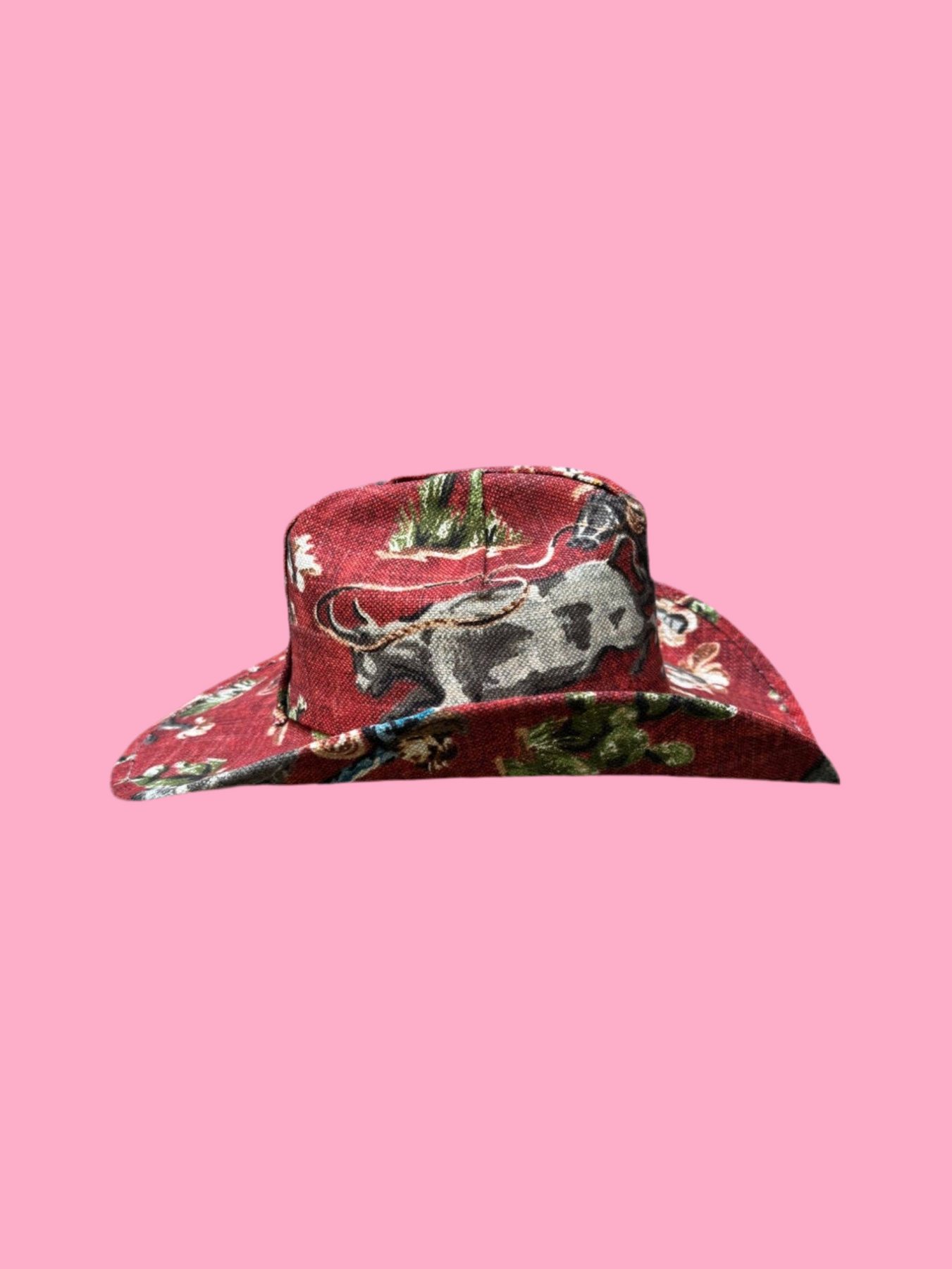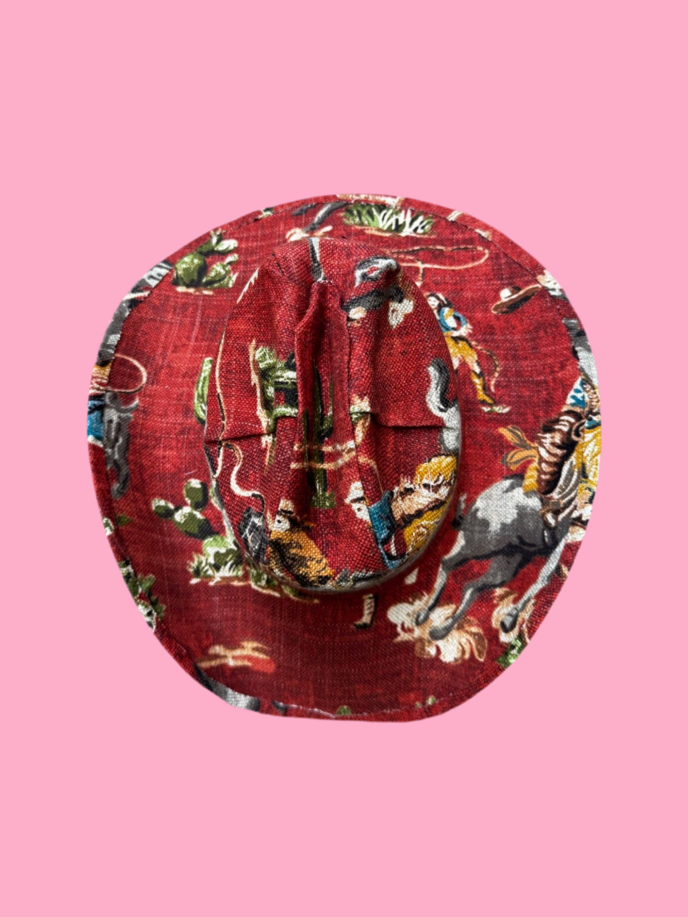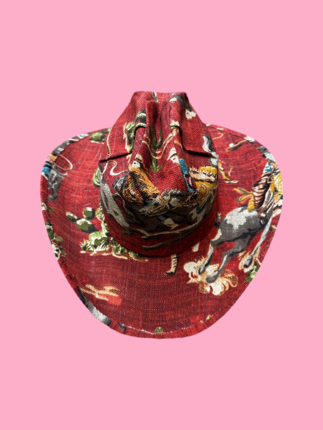 Fierce and unforgettable, Wild West Scarlett combines the spirit of the frontier with the bold elegance of a deep crimson hue. The vibrant red canvas is adorned with iconic Western imagery, creating a striking contrast that captures the rugged beauty of cowboy culture. Perfect for those who want to stand out, this hat is a daring tribute to the bold and adventurous souls who ride through life with fearless passion. Proudly American Made. Exclusive fabric hats created and handmade by designer, Lexi Whaley. Rare opportunity to own as each hat is uniquely special. SIZING S/M 19in-22.75in | 48cm-57.5cm