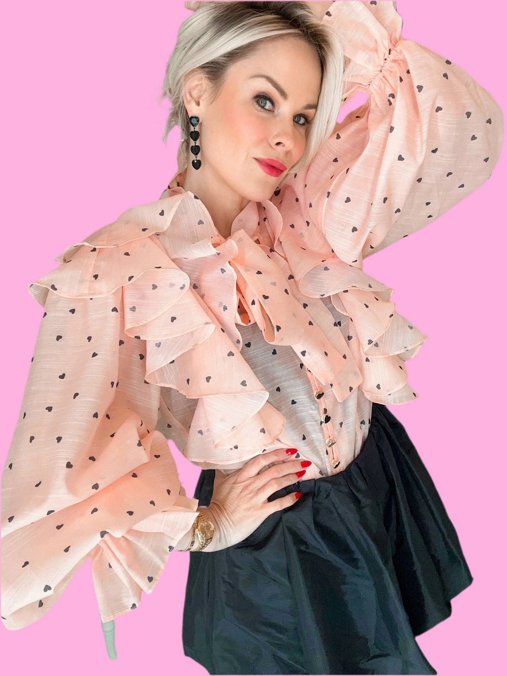 Heart Print Long Sleeve Neck Self Tie Bow Blouse