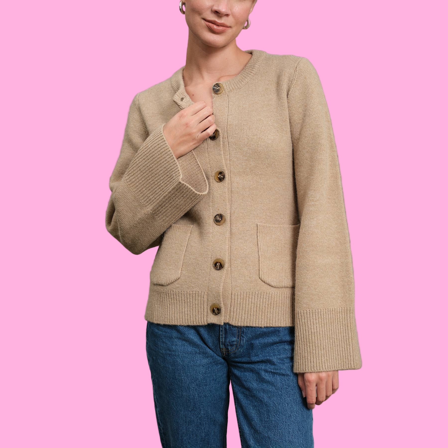 Elevate your wardrobe with The Jenny Cardigan. Crafted from a luxurious, soft knit, this modern twist on a classic cardigan features elegant bell sleeves and horn-style buttons. Front patch pockets and a clean round neckline add functional details to this sophisticated piece.